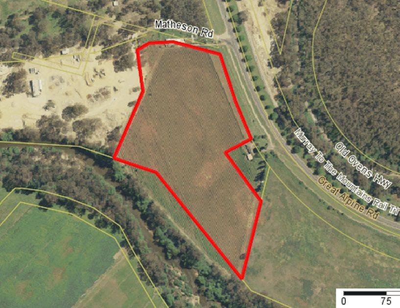 Only 3 kilometres from the Post Office on the Great Alpine Road towards Wangaratta this property has many possibilities. 5.5 hectares (13.5 acres) of fertile river flats with permanent underground irrigation and a 22 mega litre irrigation licence, a 115hp Fiat motor on a 5 x 6 Ajax pump with the ability to irrigate the whole property at once. Currently planted to vines the productive soils will grow almost anything. A lock up shed with skillion area and old cottage make up the improvements, there is also town water and 3 phase power connected