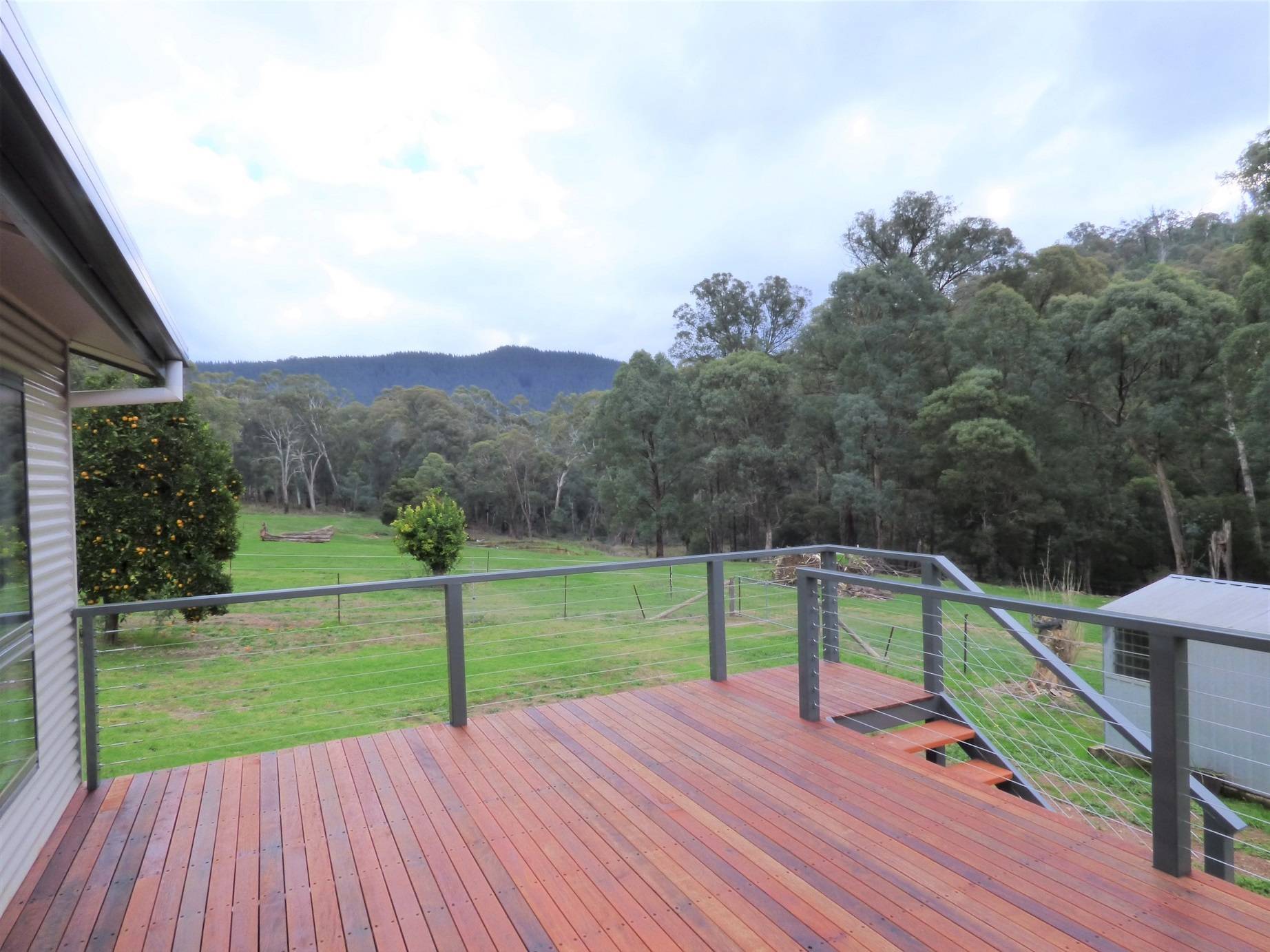 On 2.27 hectares (5.6 acres) of land with frontage to the Havilah Creek this very neat property will suit a myriad of property owners looking for some room and plenty of peace and quiet. Totally refurbished the 3 bedroom home has been – re-clad, re-wired, re-plumbed, new floor coverings, plastered, painted, insulated ceiling and walls, double glazed, new bathroom with bath and separate shower, ensuite, built in robes and ceiling fans in all bedrooms, a large open plan living area with reverse cycle air conditioning and a combustion wood heater. The new kitchen with gas cooktop and electric oven opens onto a large decked area offering outdoor living with a view. The property has an abundance of water with 6 dams (some spring fed), rainwater tank and creek frontage. Currently one paddock with very good boundary fencing it could be easily sectioned to create smaller paddocks for better stock control. There is a garden shed plus a large open shed offers plenty of storage area. In a very scenic area of the Havilah Valley with plenty of native wildlife and few neighbours this is a great opportunity to buy a country getaway with little to do.