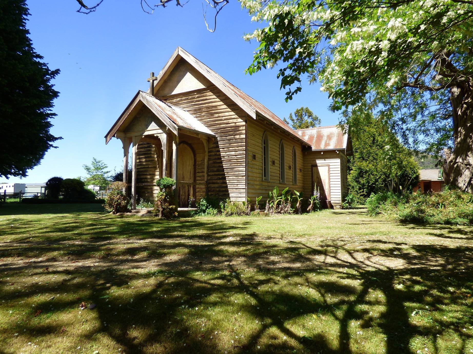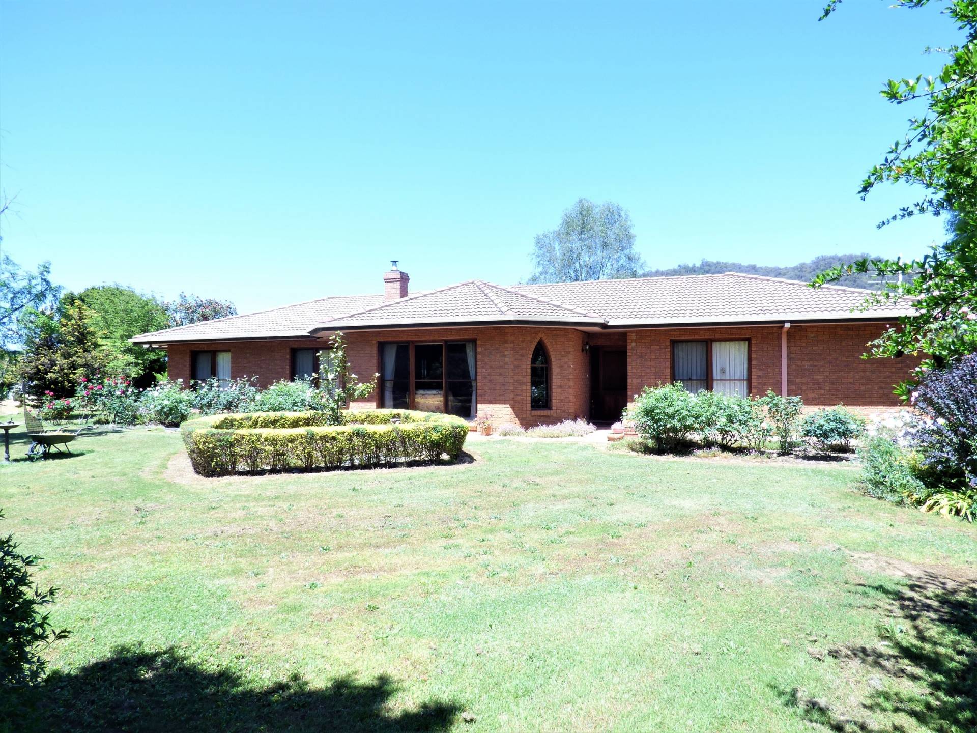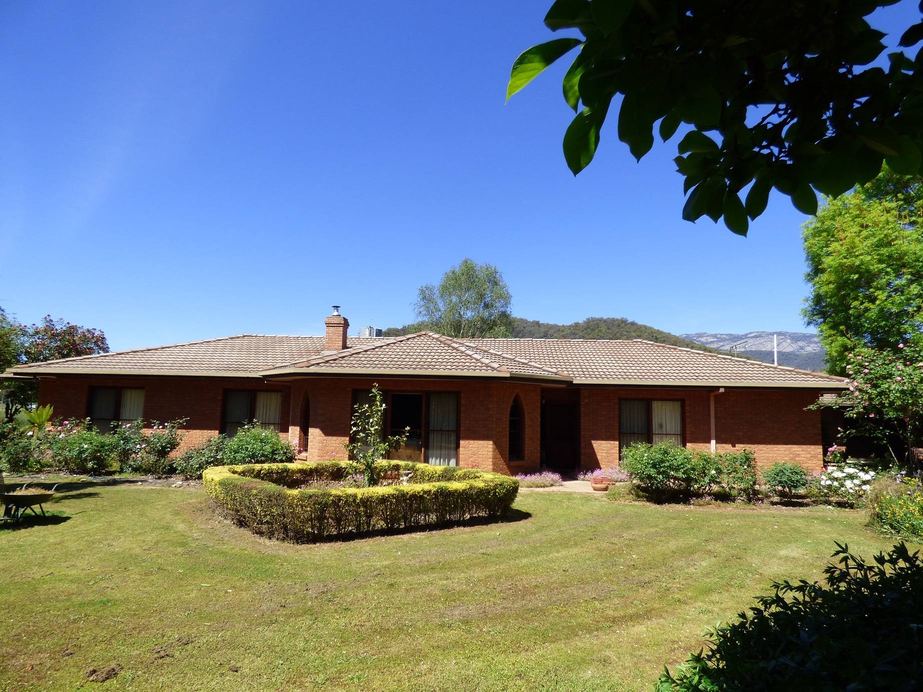 Located between Bright & Myrtleford on the Great Alpine Road on approximately 5,500 square metres of land this substantial, quality built solid brick residence features; a spacious separate lounge room, combined kitchen and dining room with slate tiled flooring, electric Tasmanian Oak kitchen, 4 or 5 bedrooms, an ensuite, main bathroom and 3rd shower and toilet, electric floor heating , 2 reverse cycle air conditioners and a wood heater and plenty of storage. There is also a double garage and outdoor patio area with an excellent view of Mt Buffalo. Set amongst the well-established parklike surrounds with many exotic plant species is the historic former Church of England Church adding another dimension with many possibilities – an art studio etc. Handy to the snowfields and the Rail Trail across the road the property is suited to a range of property owners.