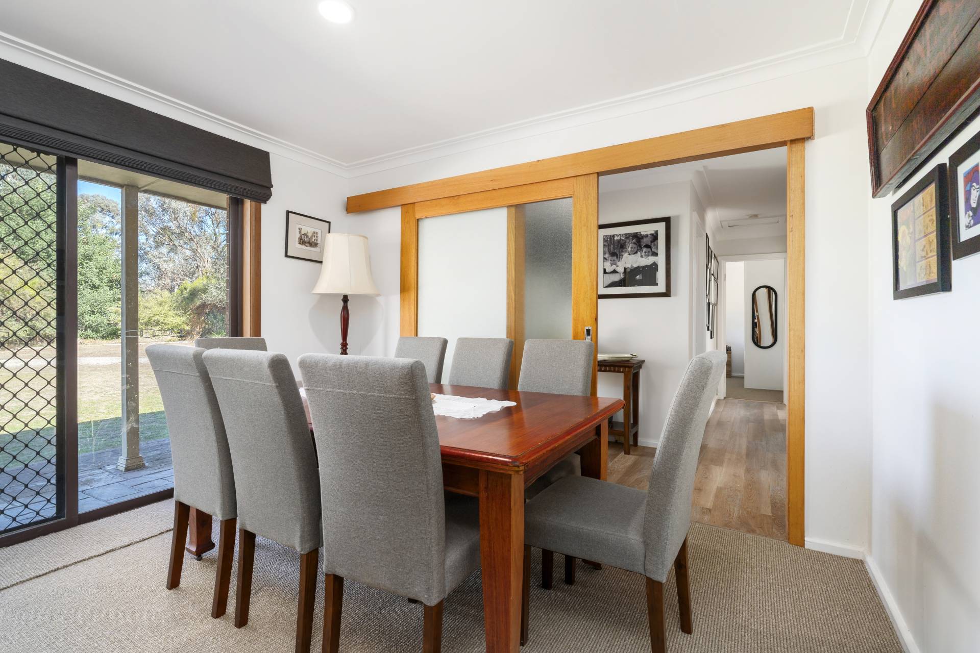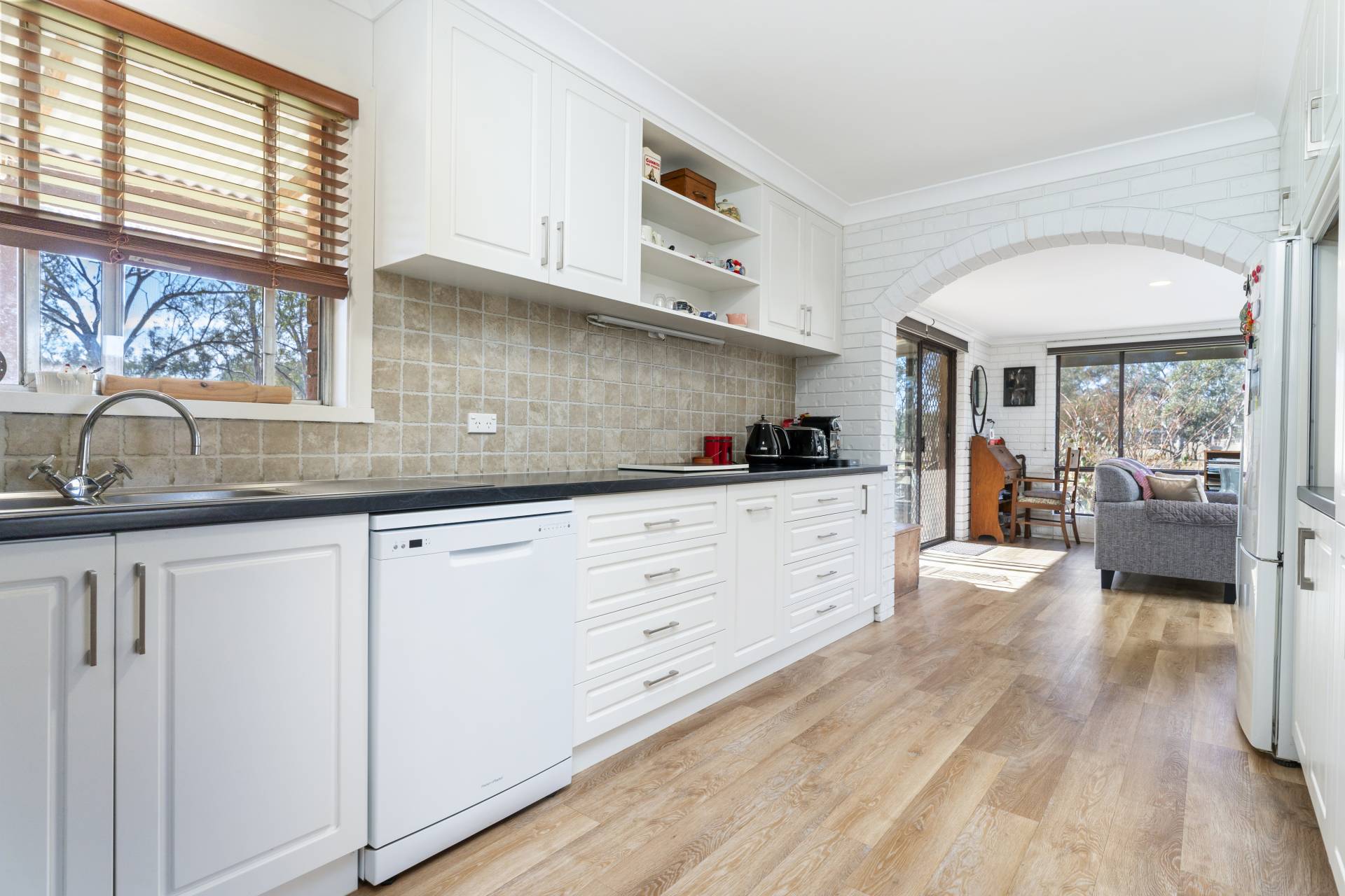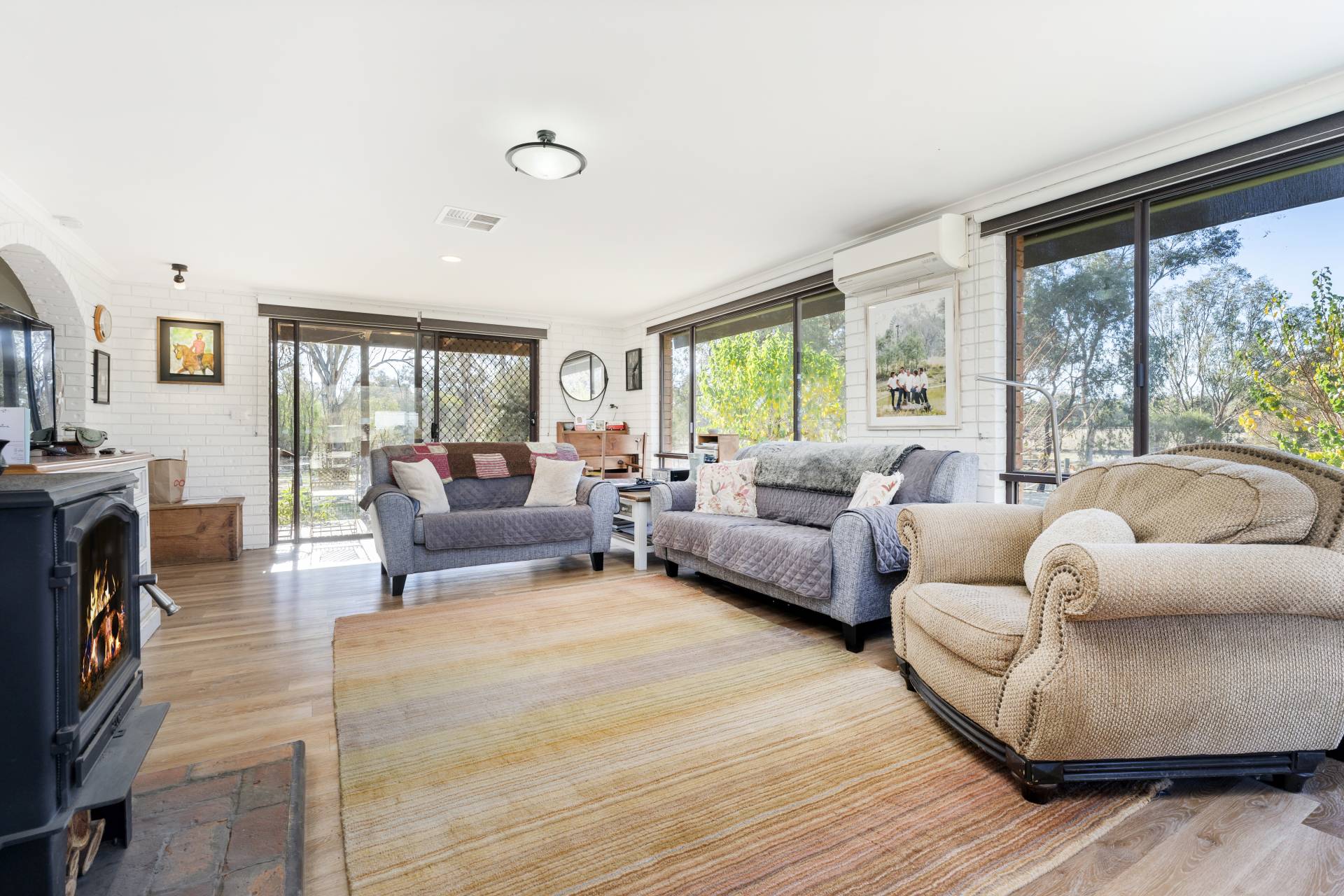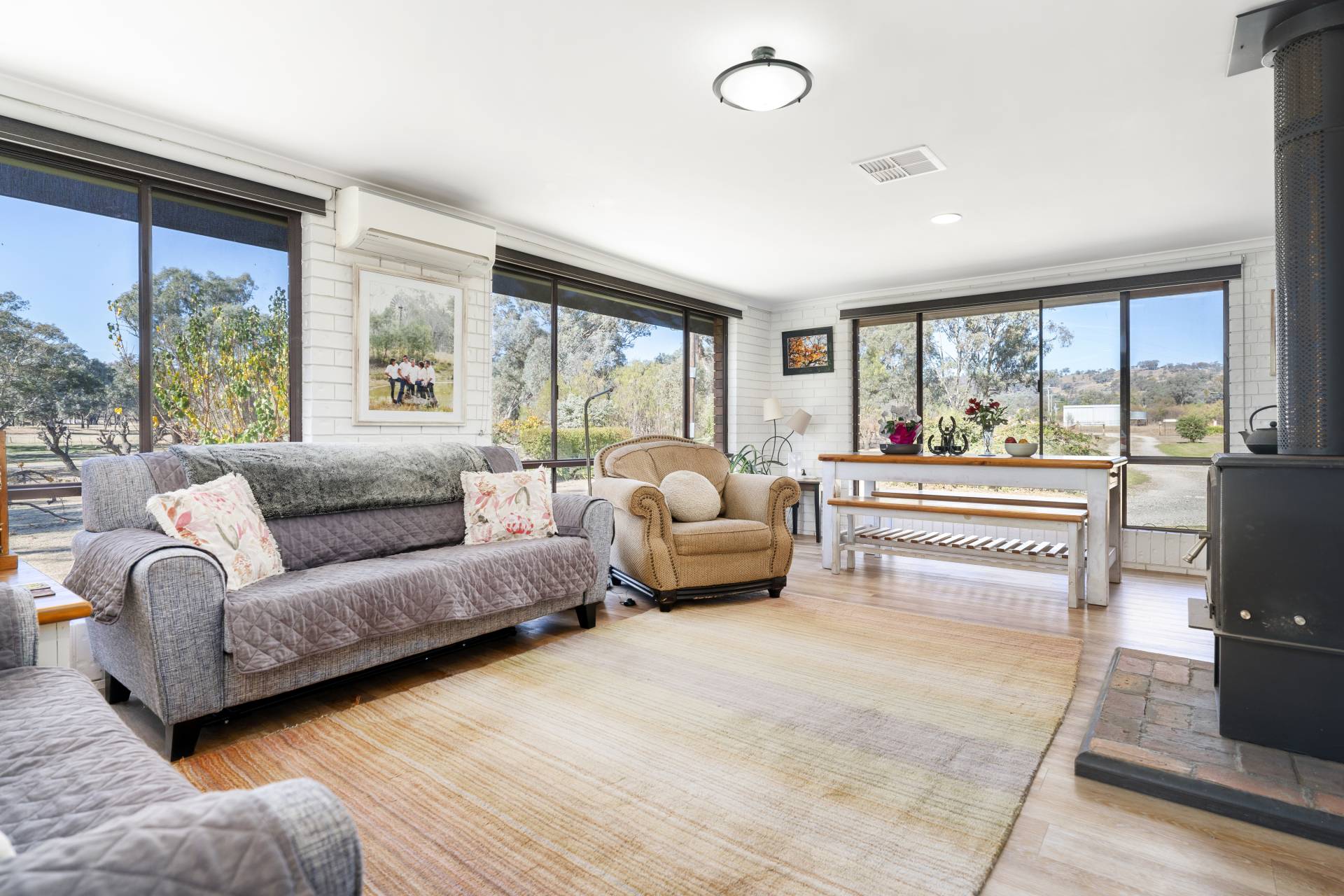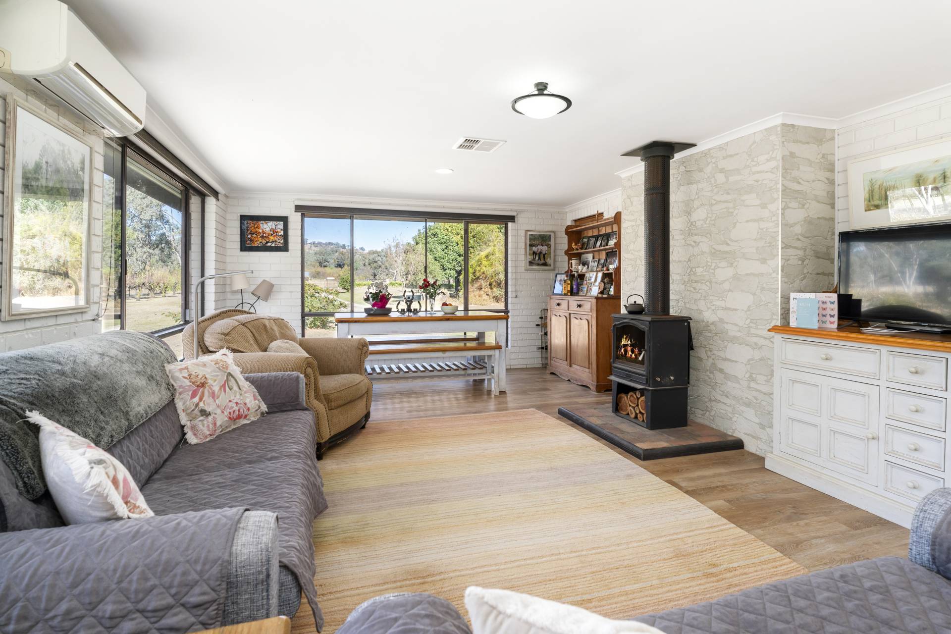 Set back from the road, offering privacy and tranquility, the homestead has been tastefully refurbished and comprises 3 bedrooms with built-in robes, updated main bathroom, and internal laundry with second toilet. Featuring a beautifully renovated modern country-style kitchen equipped with gas cooker, dishwasher and ample storage. Living areas consist of a spacious front lounge/dining room with wood fire, and a light filled open plan meals/family room with wood fire and split system air conditioner. Ducted evaporative cooling, fresh paint throughout, new carpet and timber look floors complete the home.