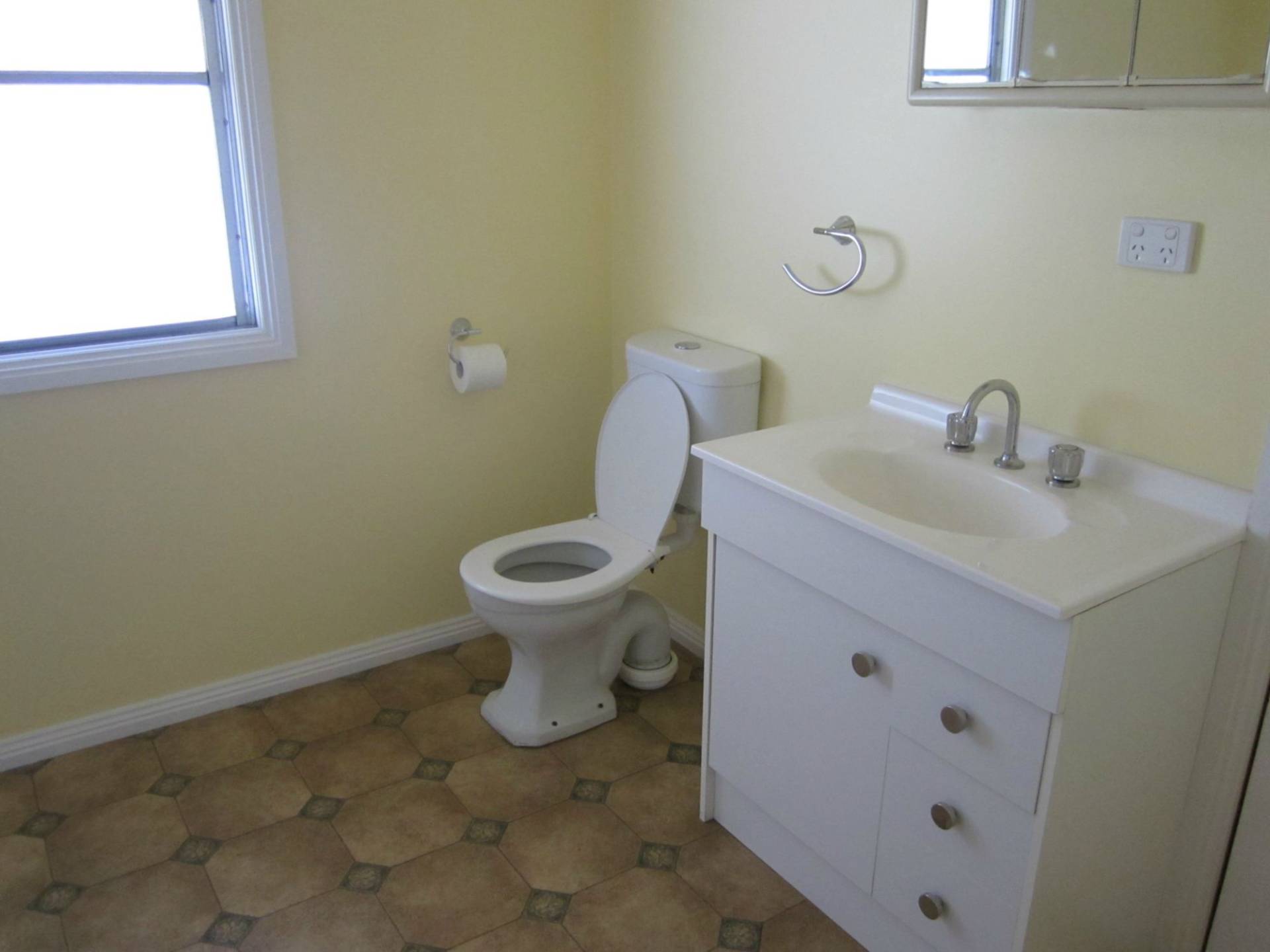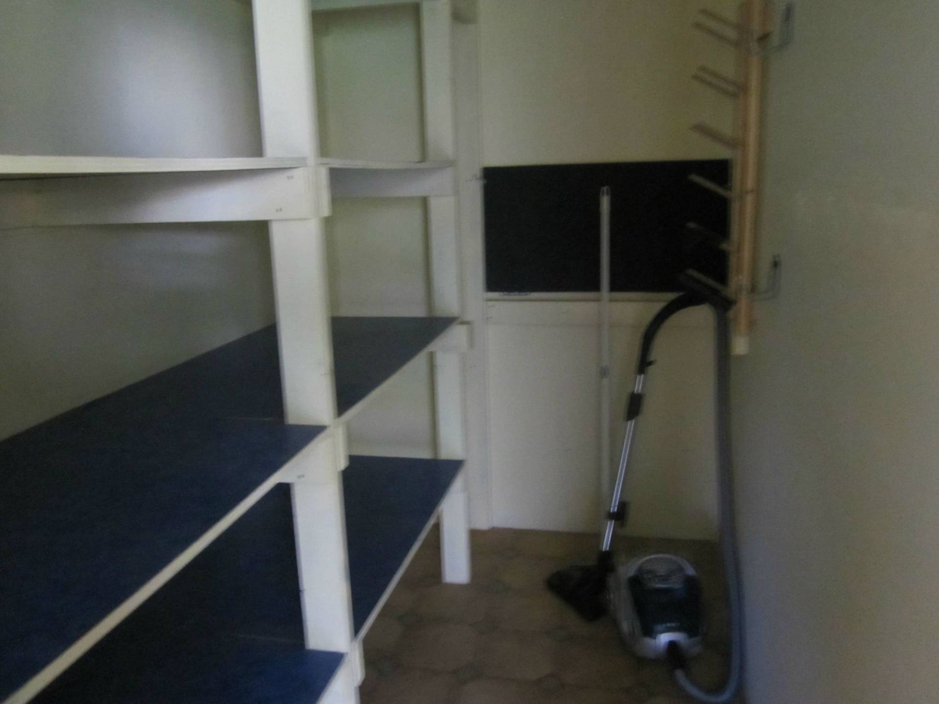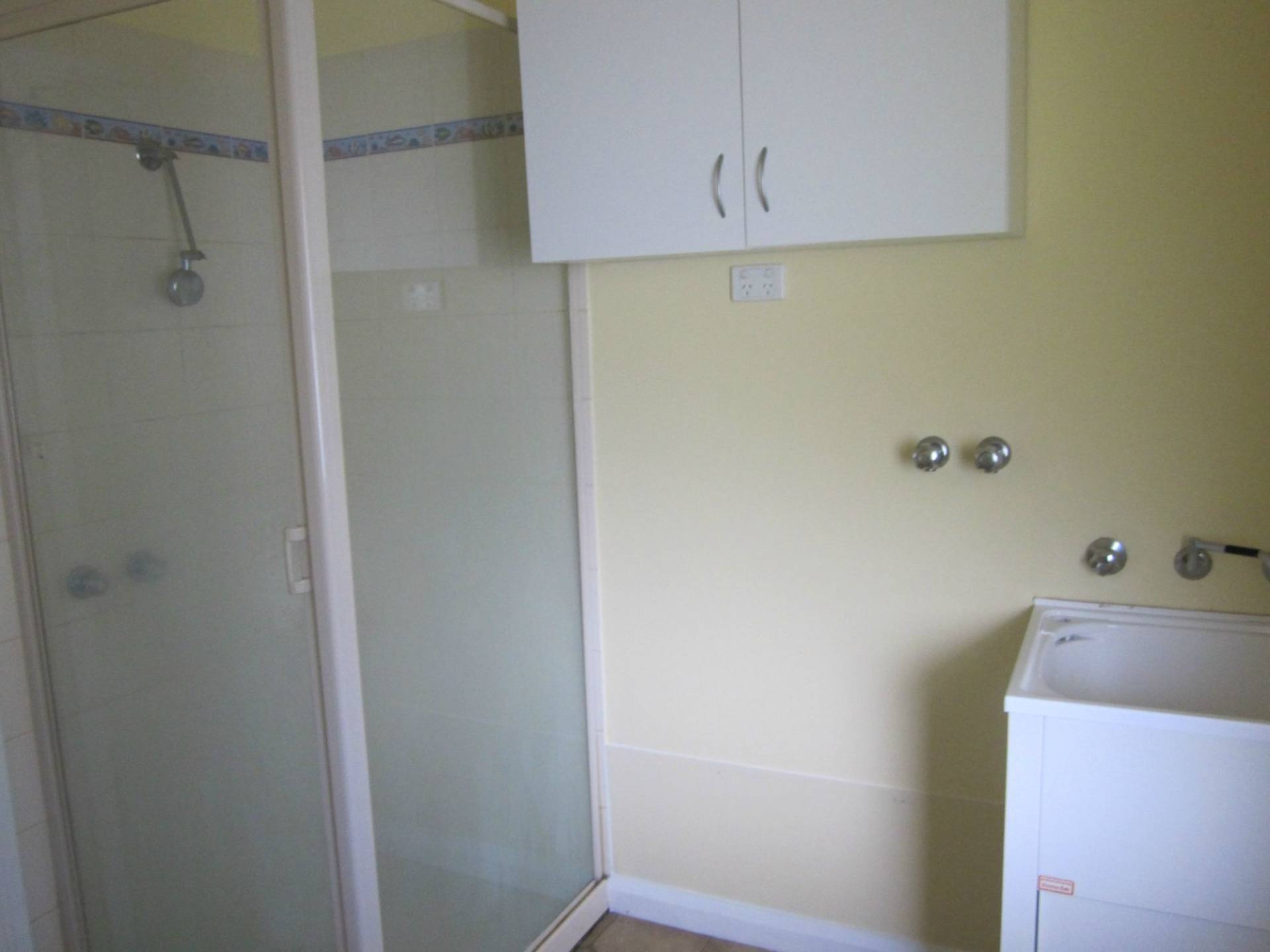 Combined bathroom/laundry with shower. Small store room with shelves.